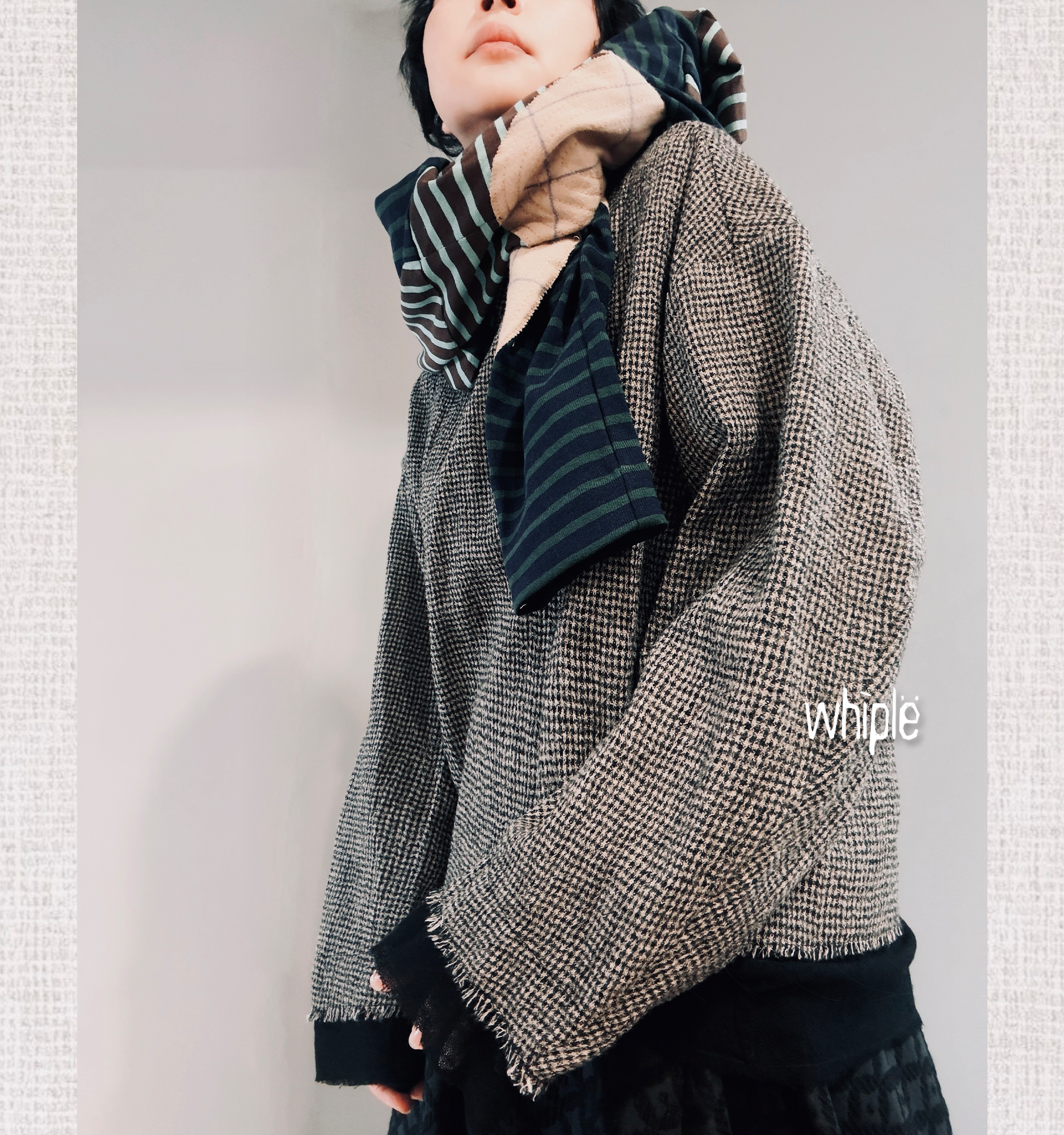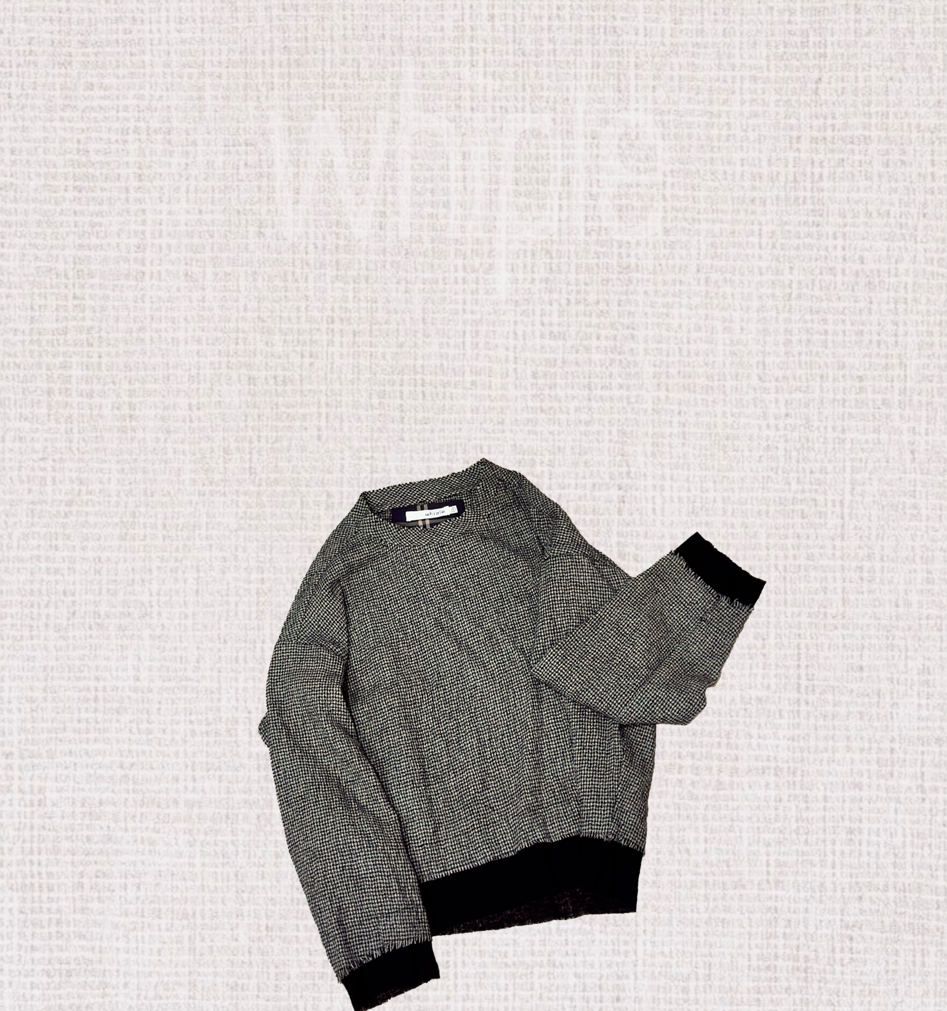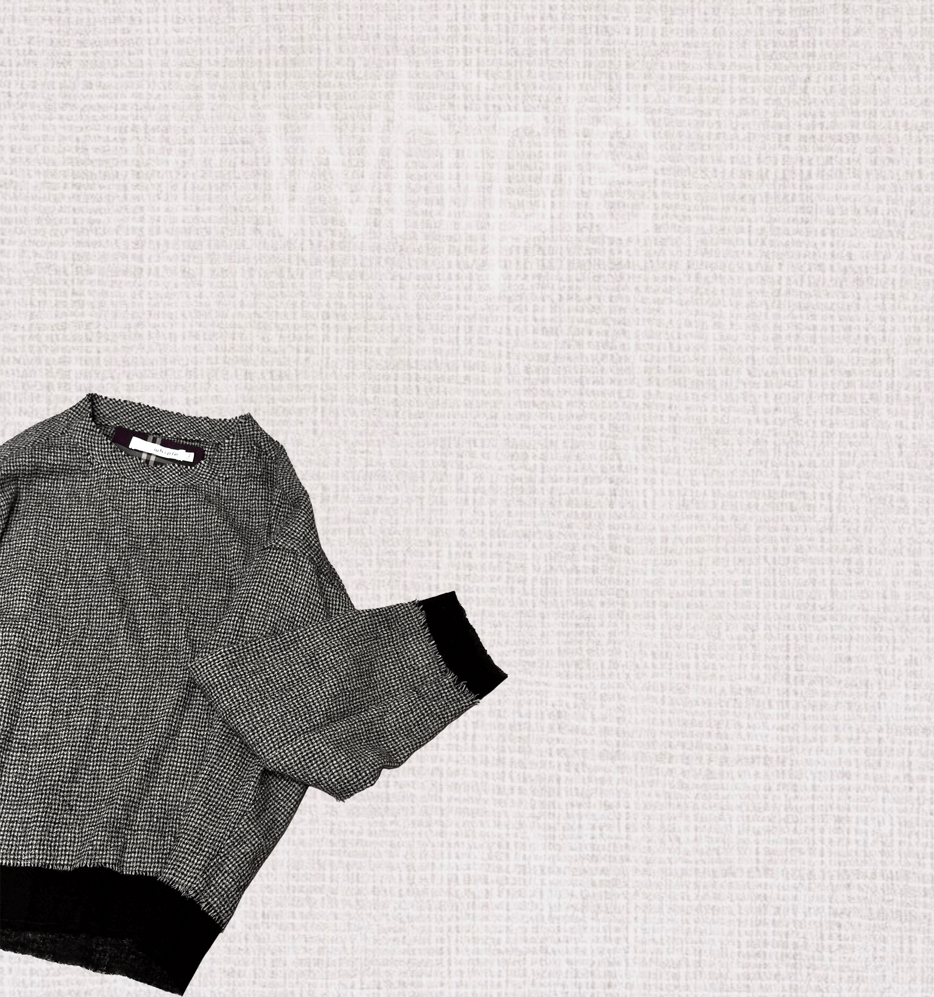 以100%超細羊毛織成千鳥格紋,袖口與下襬拼接素黑羊毛,層次細膩。
