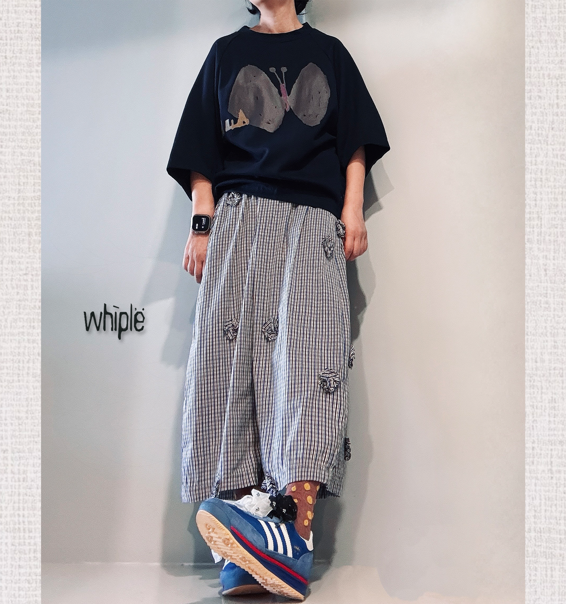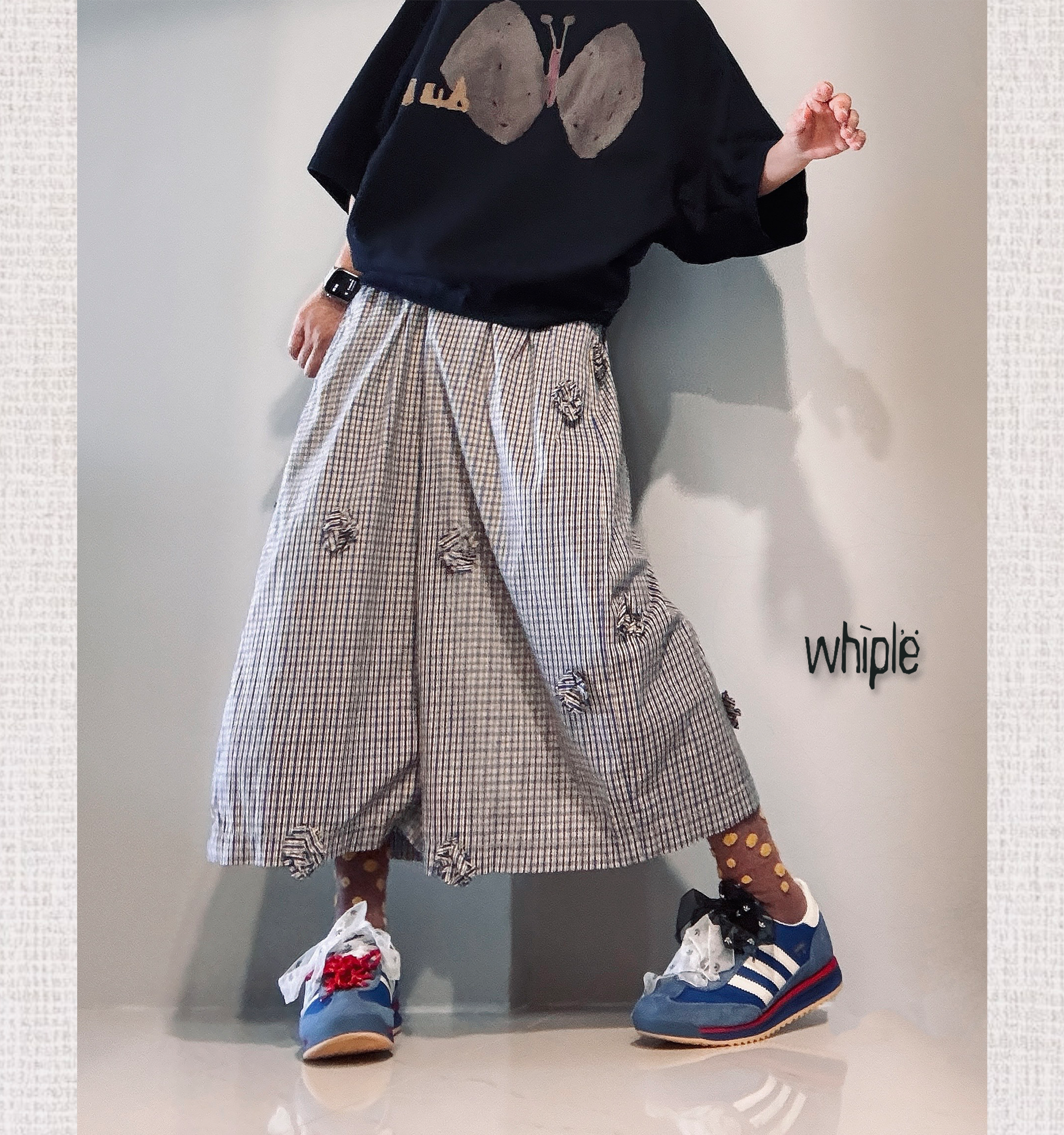以經典格紋為基底,剪裁出俐落的 8 分寬褲版型,